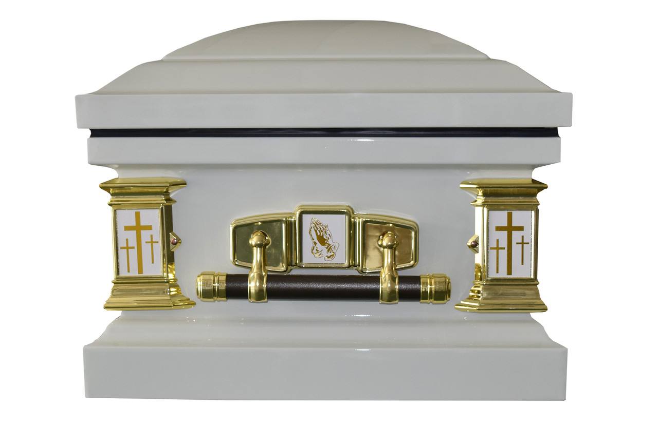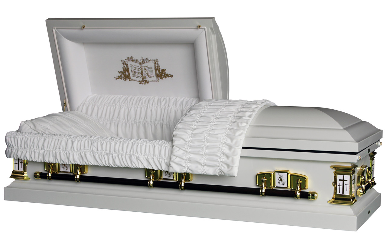 Metal Casket:White Cross’ Lords Prayer Casket with White Velvet Interior